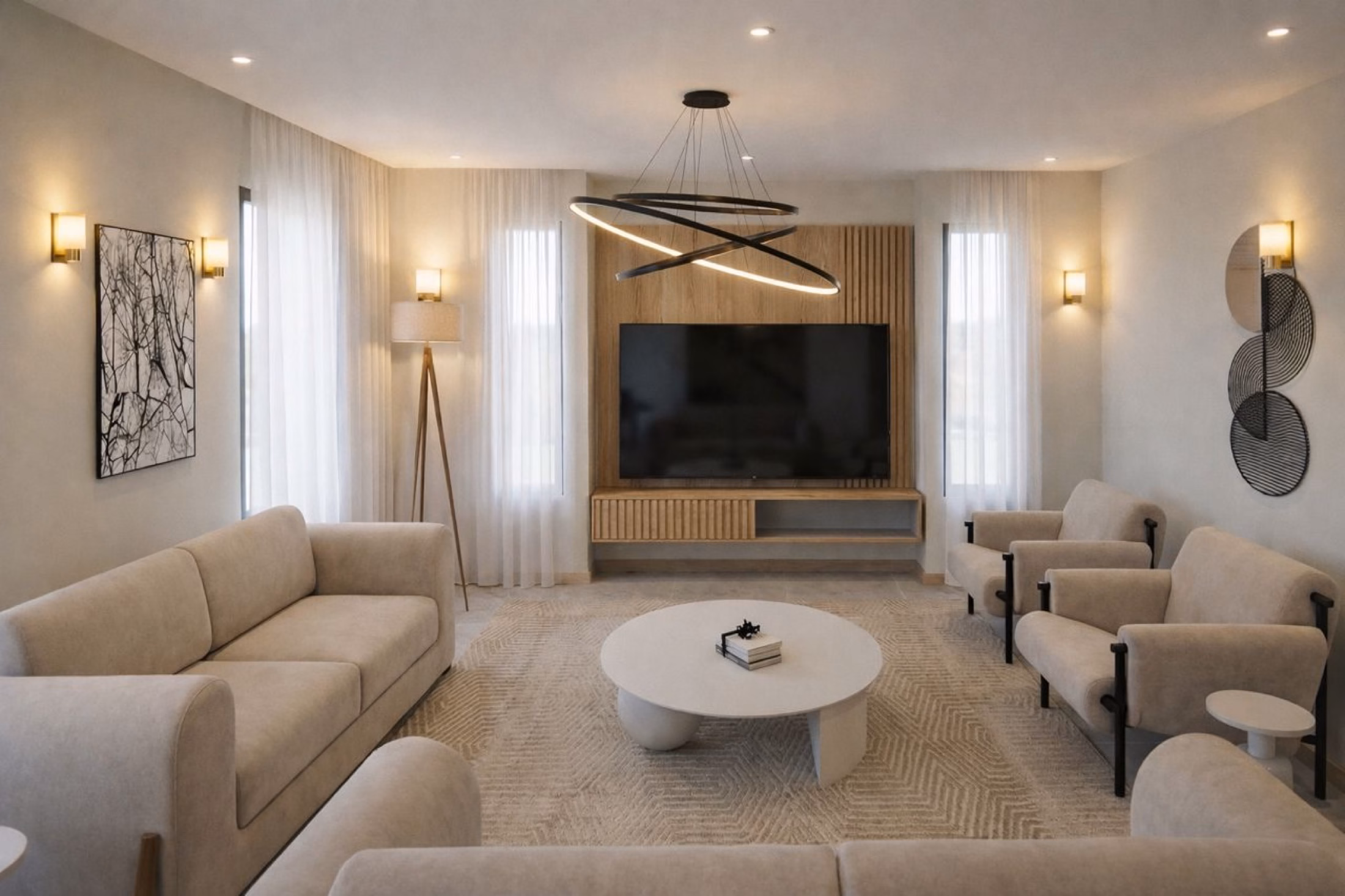 Living Spaces: Open-plan living and dining areas with statement pendant lighting and floor-to-ceiling natural light.